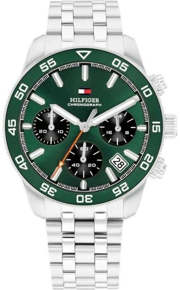 Ανδρικό αναλογικό ρολόι χεριού με μηχανισμό Quartz χρονογράφο από την TOMMY HILFIGER, με πλαίσιο και μπρασελλέ από ανοξείδωτο ατσάλι σε ασημί χρώμα και καντράν πράσινο Πράσινο. Ενα ξεχωριστό ρολόι για το χέρι. Μια όμορφη πρόταση για τα γενέθλια, πτυχίο ή για οποιαδήποτε άλλη όμορφη στιγμή σας!!!