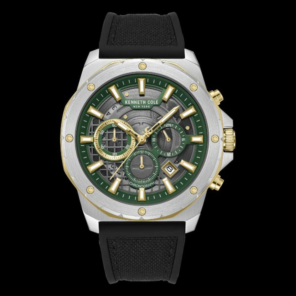 Ανδρικό αναλογικό ρολόι χεριού με μηχανισμό Quartz από την KENNETH COLE, με πλαίσιο από ανοξείδωτο ατσάλι σε ασημί χρώμα. Λουράκι μαύρο από υποαλλεργική σιλικόνη και καντράν πράσινο Πράσινο. Ενα εξαιρετικό ρολόι για το χέρι. Προσφέρεται για τα γενέθλια, πτυχίο ή για οποιαδήποτε άλλη όμορφη στιγμή σας!!!