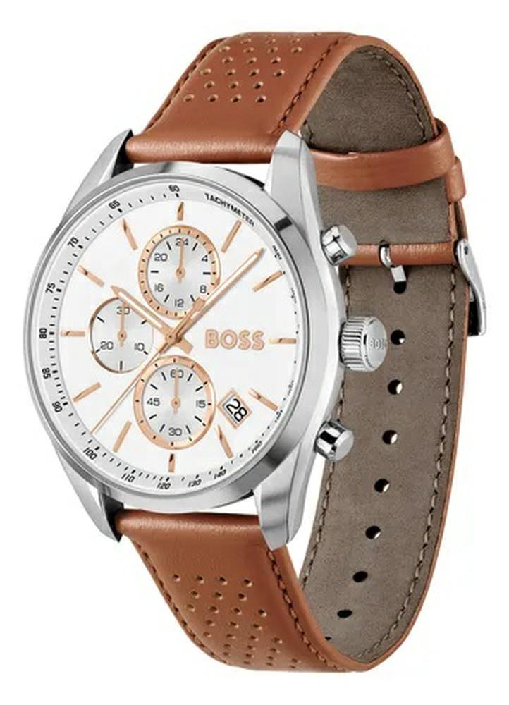Ανδρικό αναλογικό ρολόι χειρός Boss με μηχανισμό Quartz και λειτουργία χρονογράφου, ιδανικό για καθημερινή χρήση με σπορ-κομψό ύφος. Η κάσα των 43mm διαθέτει ασημί πλαίσιο από ανοξείδωτο ατσάλι, προσφέροντας αντοχή και διαχρονικό χαρακτήρα. Το λευκόκαντράν χαρίζει καθαρή ανάγνωση και μοντέρνα αισθητική, ενώ το ταμπά λουράκι από γνήσιο δέρμα εξασφαλίζει άνετη εφαρμογή. Εξαιρετική επιλογή για δώρο σε γενέθλια ή επέτειο.