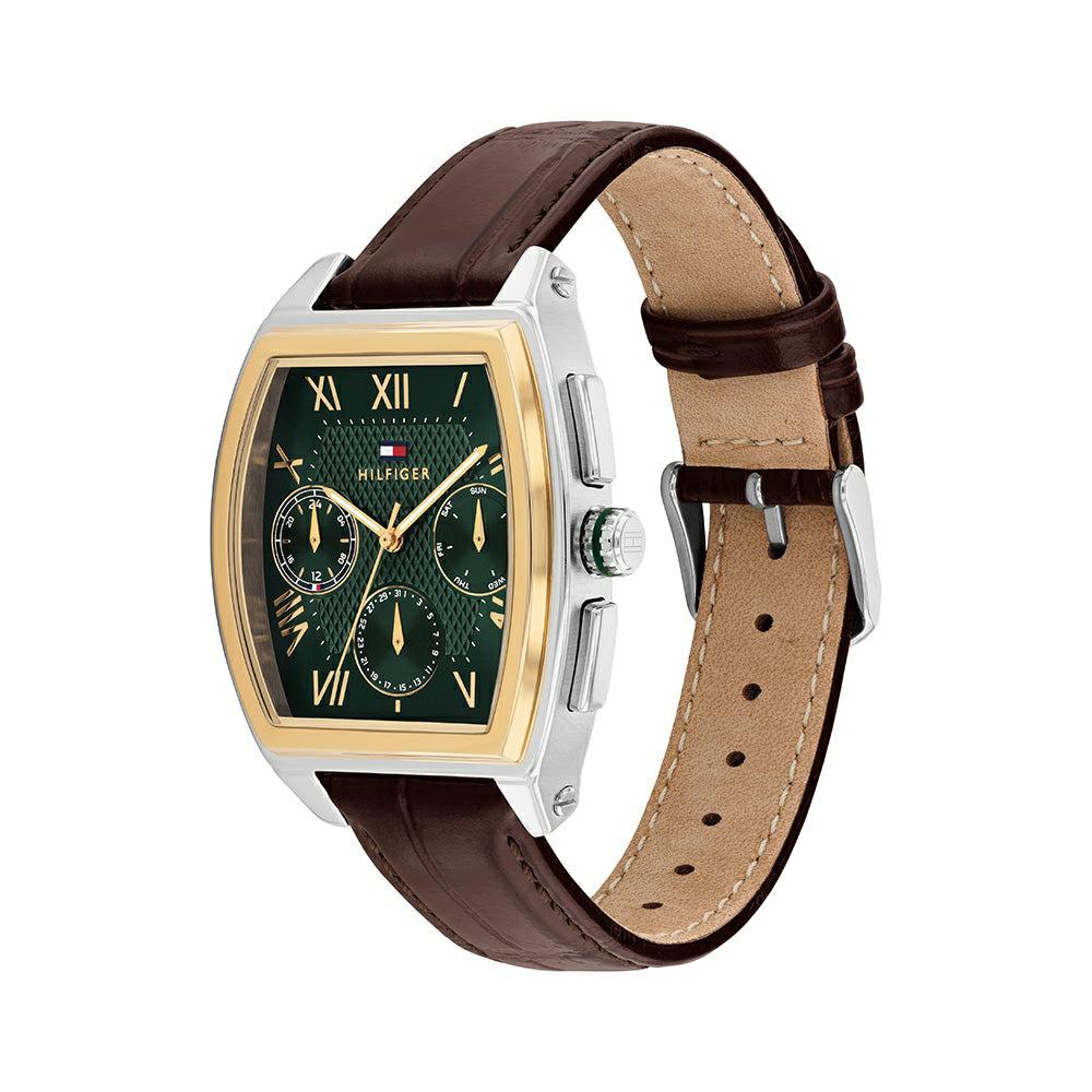 Ανδρικό αναλογικό ρολόι TOMMY HILFIGER με αξιόπιστο μηχανισμό Quartz και κάσα 36mm, ιδανική για κομψή, διακριτική εμφάνιση. Το πλαίσιο από ανοξείδωτο ατσάλι σε διχρωμία ασημί-χρυσό προσθέτει premium χαρακτήρα, ενώ το καφέ λουράκι από γνήσιο δέρμα εξασφαλίζει άνετη εφαρμογή. Το πράσινο καντράν δίνει μοντέρνα πινελιά και ξεχωρίζει εύκολα. Μια προσεγμένη επιλογή δώρου για γενέθλια, επέτειο ή ιδιαίτερες στιγμές.