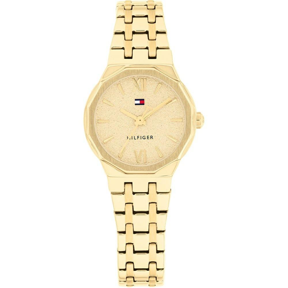 Γυναικείο αναλογικό ρολόι TOMMY HILFIGER με αξιόπιστο μηχανισμό Quartz και κομψή διάμετρο κάσας 27mm, ιδανική για λεπτό καρπό. Το πλαίσιο και το μπρασελέ είναι από ανθεκτικό ανοξείδωτο ατσάλι σε λαμπερή χρυσή απόχρωση, που δένει αρμονικά με το χρυσαφί καντράν. Ο διαχρονικός του σχεδιασμός το κάνει εύκολο να φορεθεί από το πρωί έως το βράδυ και αποτελεί εξαιρετική επιλογή για δώρο σε γενέθλια ή γιορτινές περιστάσεις.