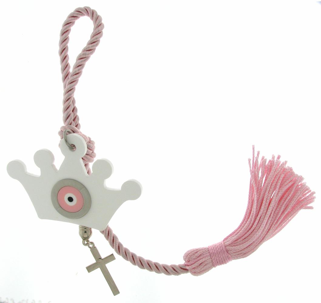 Παιδικό γούρι κορόνα babyQ για κοριτσάκι από ανοξείδωτο ατσάλι σε άσπρο-ροζ χρώμα. Ενα εξαιρετικό δώρο για την κούνια. Προσφέρεται για τη γέννηση, για τη βάπτιση, του!!!