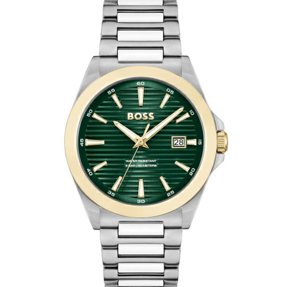 αναλογικό ρολόι χεριού με μηχανισμό Quartz από την HUGO BOSS, με πλαίσιο και μπρασελλέ από ανοξείδωτο ατσάλι σε ασημί-χρυσό χρώμα και καντράν πράσινο Πράσινο. Ενα ξεχωριστό ρολόι για το χέρι. Μια όμορφη πρόταση για τα γενέθλια, για την επέτειο, πτυχίο