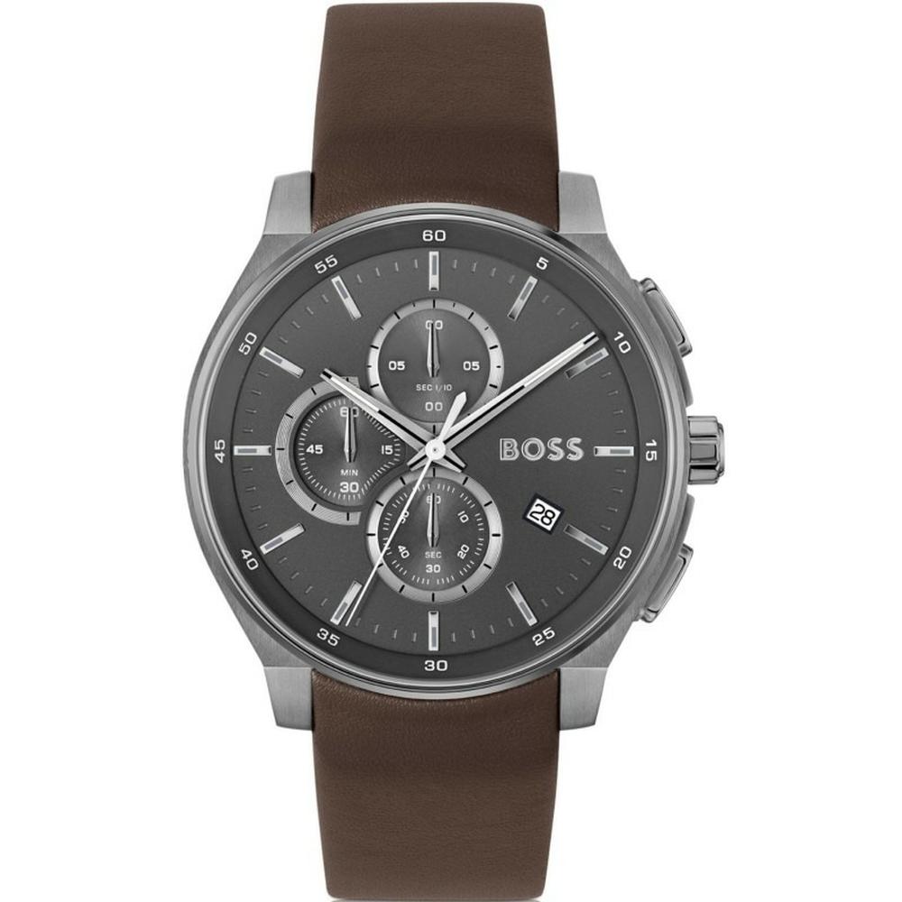 Ανδρικό αναλογικό ρολόι χεριού με μηχανισμό Quartz χρονογράφο boss, με πλαίσιο από ανοξείδωτο ατσάλι σε ανθρακί χρώμα. Λουράκι καφέ από γνήσιο δέρμα και καντράν Ανθρακί. Ενα εξαιρετικό ρολόι για το χέρι. Μια όμορφη πρόταση για τα γενέθλια, ή για οποιαδήποτε άλλη όμορφη στιγμή σας!!!