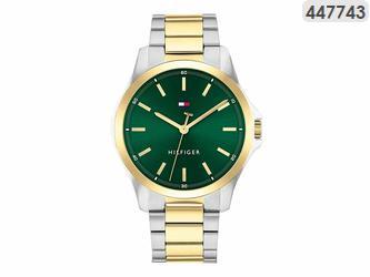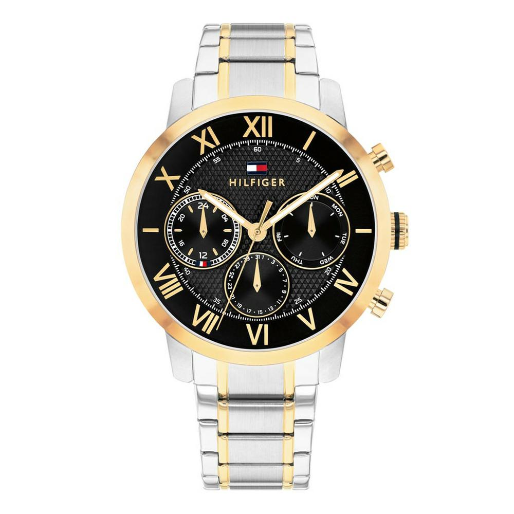 Ανδρικό αναλογικό ρολόι χεριού με μηχανισμό Quartz από την TOMMY HILFIGER, με πλαίσιο και μπρασελλέ από ανοξείδωτο ατσάλι σε ασημί-χρυσό χρώμα και καντράν μαύρο. Ενα διαχρονικό ρολόι για το χέρι. Προσφέρεται για τα γενέθλια, για την επέτειο, ή για οποιαδήποτε άλλη όμορφη στιγμή σας!!!